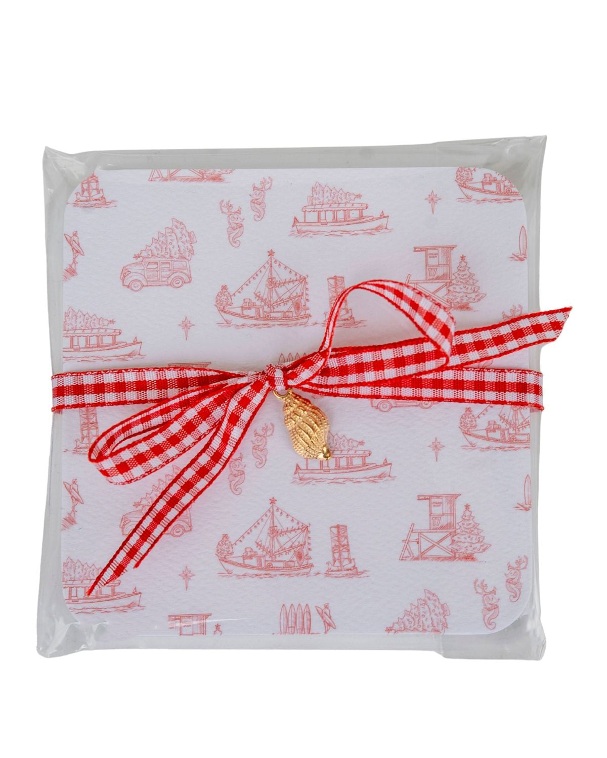 Add a festive coastal touch to your boat ride or holiday tablescape with these beautifully illustrated holiday coasters. Featuring charming red sketches of boats, lifeguard towers, Christmas trees, and seaside icons, they beautifully capture Newport’s holiday charm. Each pack includes 10 durable coasters, wrapped with a red gingham ribbon and finished with a gold seashell charm for the perfect seasonal presentation. Decorative, gift-ready, and full of festive spirit—these coasters bring holiday cheer to any gathering.