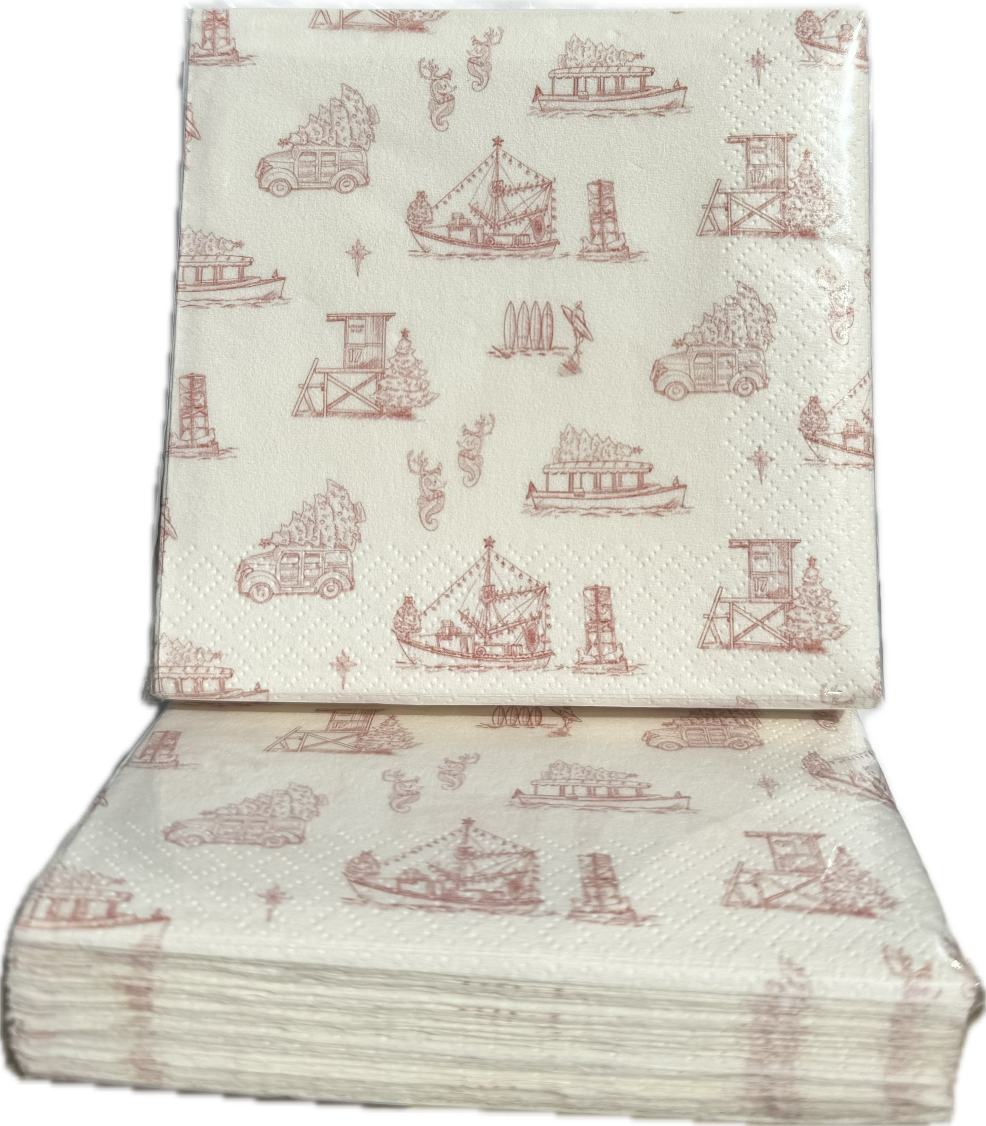 Add a touch of Newport’s festive charm to any gathering with our Holiday Toile Napkins. Featuring hand-drawn coastal holiday scenes—light-strung Duffy boats, surfboards, lifeguard towers, vintage cars carrying Christmas trees, and whimsical seahorses—this soft red-on-cream design brings the perfect blend of elegance and coastal cheer.